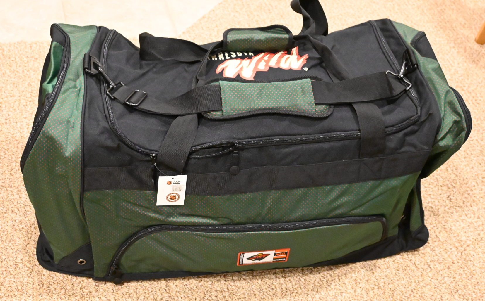 Large Minnesota Wild Duffle Bag, ideal for storing hockey gear.