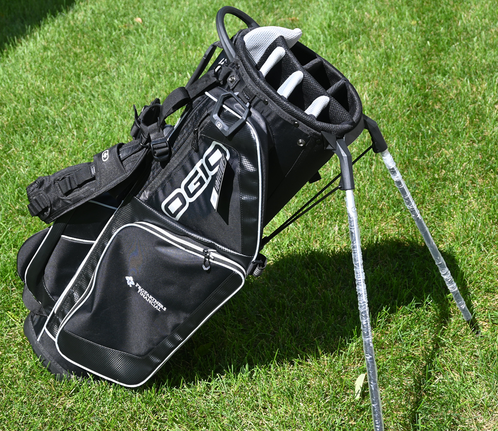 OGIO's SHOXX X4 full-suspension system , 9.5" Woode top with integrated grab handle and oversized putter pit ZBP (Zipperless Ball Pocket) Low-profile OGIO Ball Silo (ball dispenser) 6 zippered pockets Fleece-lined valuables pocket Walking-accessible water bottle holster Scorecard sleeve